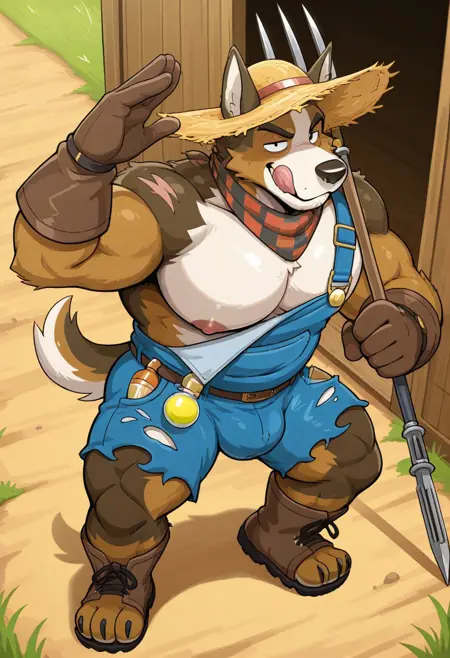 옷차림 프롬프트: "상의 없음, 찢어진 파란 작업복, 스카프, 발가락 없는 부츠, 청바지, 벨트, 짚모자, 하와이안 셔츠, 소매 없음, 샌들, 창기물 들고 있음"
