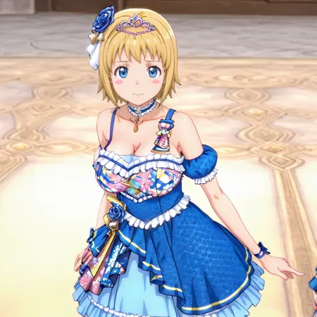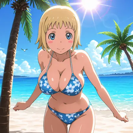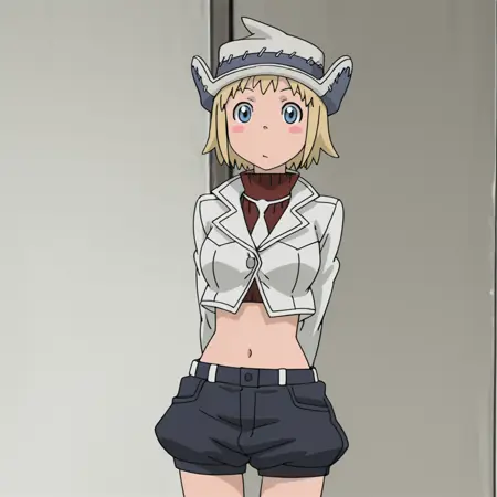 トリガー:Patricia、ノースリーブのタートルネック、1girl、金髪、帽子、腹部、短髪、肩出し、ショートパンツ、ネクタイ、青い目、へそ、カーディガン