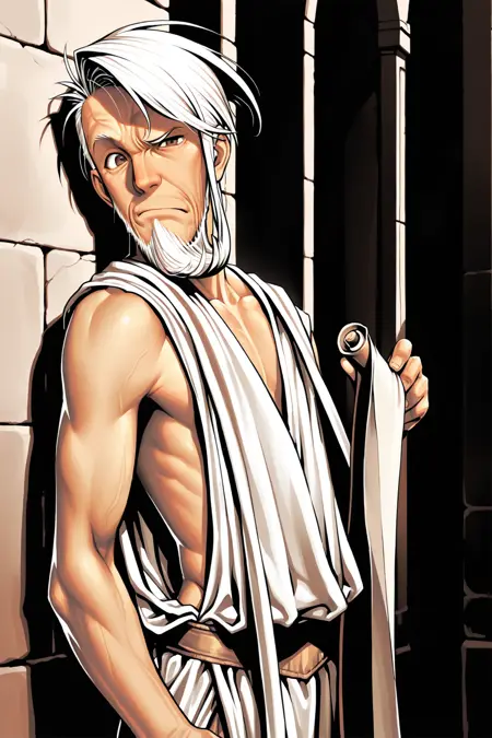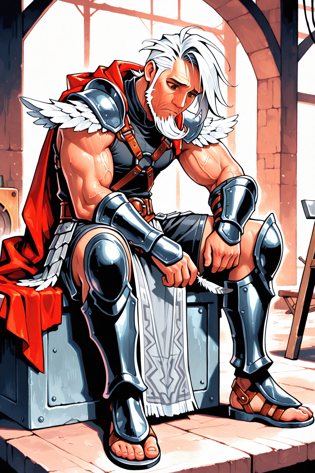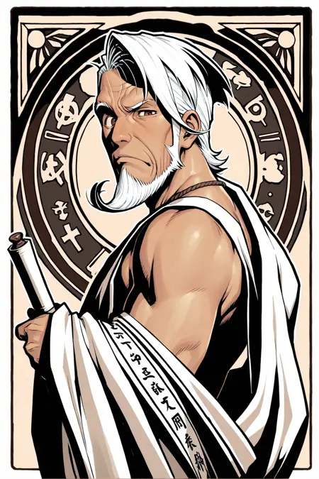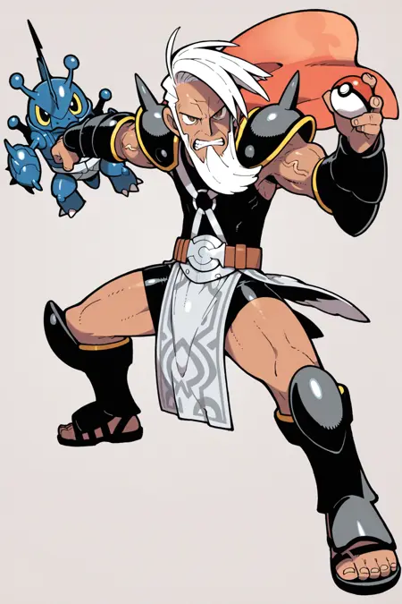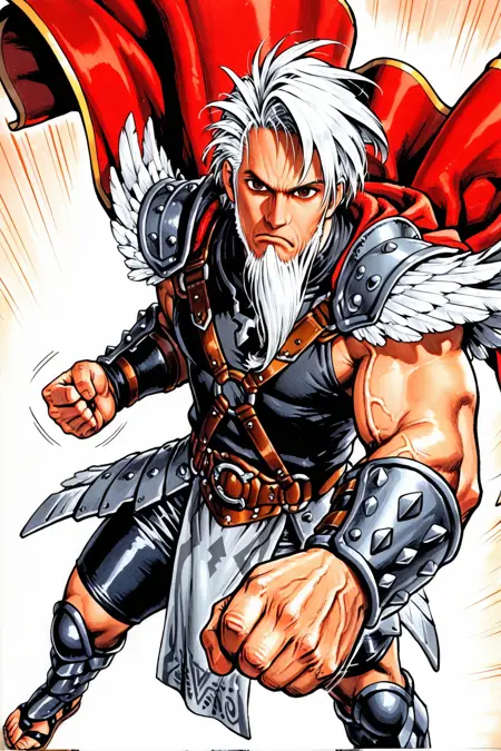 | 训练词汇 | 1boy, male focus, old, old man, solo, white hair, sideswept hair, ((sideswept beard)), brown eyes, muscular, veiny arms, yellow trimmed red cape, feathered pauldrons, sleeveless black shirt, ((black shorts)), brown body harness, brown belt, brown belt buckle, grey pelvic curtain, ((grey pteruges)), black vambraces, black greaves, sandals已复制! |