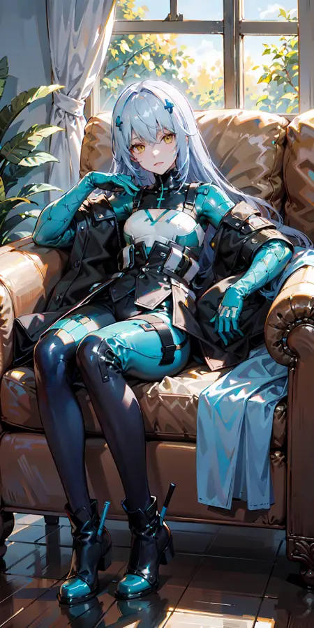 LYFEB, tactical_bodysuit, asymmetrical_leggings, hairclip, gloves, boots, light_blue_hair, long_hair, yellow_eyes, looking at viewer, naughty face, 1girl, standing, living_room, day, dappled_sunlight, window, blue_sky, (masterpiece, best quality, beautiful and aesthetic: 1.2), lora:LYFEB-v1:0.7