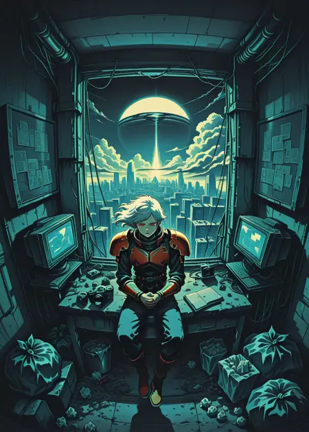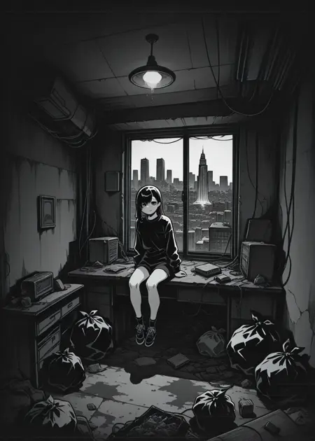 一个以复古、单色赛博朋克风格为指定的模型。想象电缆、机械结构、粗粝感、污垢、油渍和瘦削的人物,人类与机器的融合。