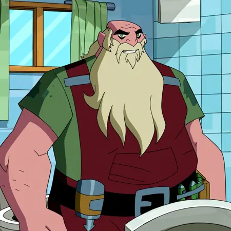 Bill Gacks, blonde hair, green shirt, red overalls, belt, old man, bald, beard, fat, chubby, green eyes,
