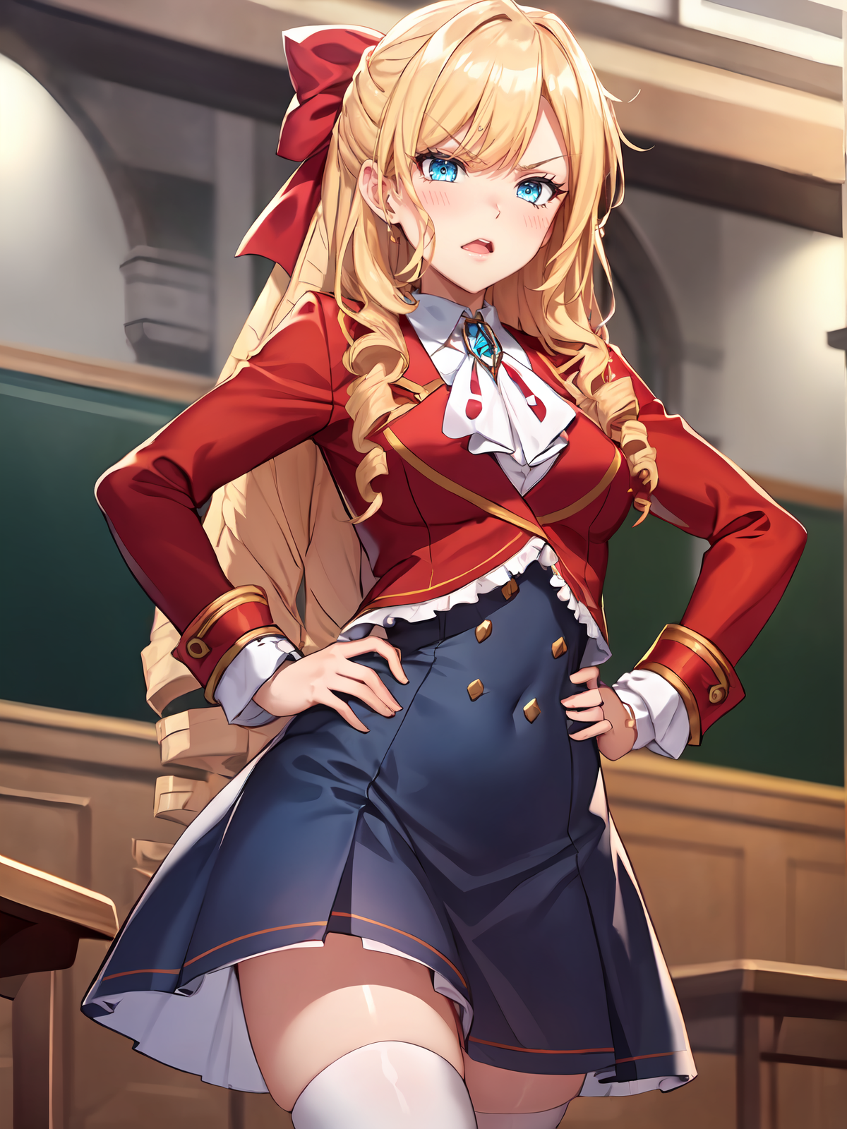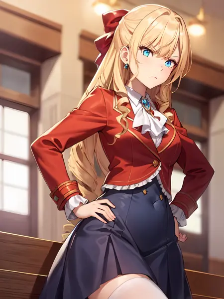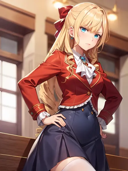 프롬프트: white thighhighs, long sleeves, jewelry, bangs, ascot, ribbon, brooch, red jacket, drill hair, hair bow, blue eyes, bow, school uniform, blonde hair, long hair, drill hair,