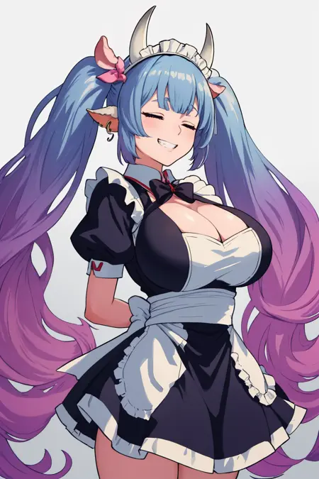 거대한 가슴, 작은 키, 그라디언트 머리카락, 매우 긴 머리카락, 소 뿔, 귀 천공, 미소