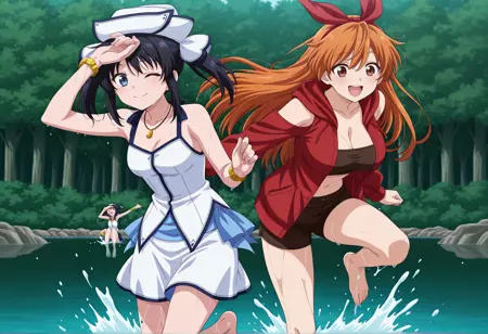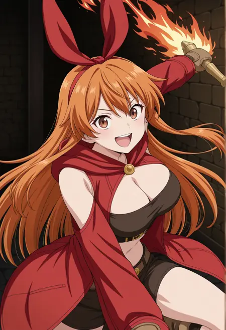 Nell: long hair, orange hair, brown eyes, red ribbon, hood, red vest, bare shoulders, mittens, open clothes, tube top, cleavage, shorts,