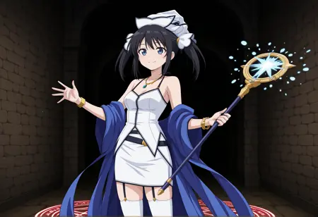 Iris: black hair, blue eyes, twintails, sleeveless, hat, necklace, bracelet, skirt, off shoulders, stole, white thighhighs, garter strap