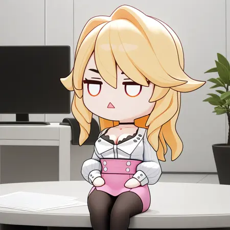 ReceptSom, ピンクのスカート, ウエストハイスカート, ペンシルスカート, ブラックのパンティストッキング, サイドスリット, ブラックのブラ, ブラの見え隠れ, 白いブラウス, 胸元, 鎖骨, フリルの長い袖, 袖口, 金髪, 長髪,
