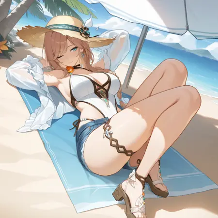 GalateaStrv, Glt_Swm, 薄茶色の髪, ターコイズ色の目, 長い髪, 白いワンピース水着, 衣装カットアウト, ハイレッグ, パンティストラップ, 短いショートパンツ, デニムショートパンツ, 青いショートパンツ, 複数の太ももストラップ, 衣服の下の水着, 足に花, 透け感のあるジャケット, 白いジャケット, 茶色の太ももストラップ, 茶色のチョーカー, オレンジ色の花, フリルジャケット, 胸元, 花のチョーカー, ビーズ, オフショルダージャケット, 水着, 横編み, わら帽子, サンハット, ハットリボン,