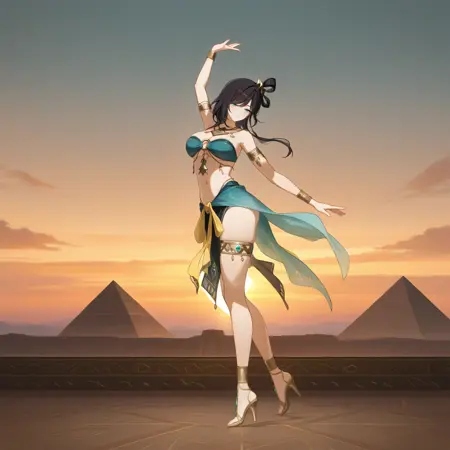 GalateaStrv, Glt_Skd, black hair, aqua eyes, long hair, arabian clothes, dancer, harem outfit, teal bikini, strapless bikini, o-ring bikini, revealing clothes, clothes around waist, jewelry, gold flower, gold necklace, armlet, gold bracelet, thighlet, multicolored skirt, hair rings, gold hair ornament, gold footwear, strappy heels,