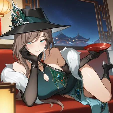 GalateaStrv, Glt_CN, 薄茶色の髪, ターコイズ色の目, 長い髪, 中華ドレス, 中国風衣装, 濃緑色のドレス, グラデーションドレス, クラヴロックカットアウト, ノースリーブドレス, フェザーボア, ペacock柄, ビーズネックレス, 透け感のある袖, カラーチェンジの黒い袖, 手首ストラップ, Oリングストラップ, 赤い房, 黒い手袋, 腕ストラップ, フェドーラ, 黒い帽子,