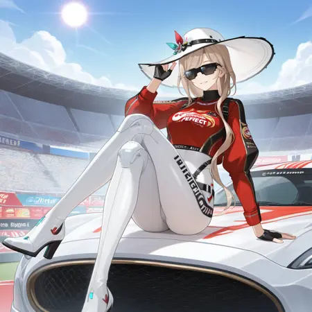 GalateaStrv, Glt_Gmr, light brown hair, aqua eyes, long hair, white bodysuit, bodysuit, black trim, thigh boots, white leggings, white footwear, harness, black undershirt, clothing cutout, black belt, cropped shirt, turtleneck shirt, red shirt, white headwear, sun hat, striped shirt, puffy sleeves, black gloves, fingerless gloves, black eyewear, sunglasses,