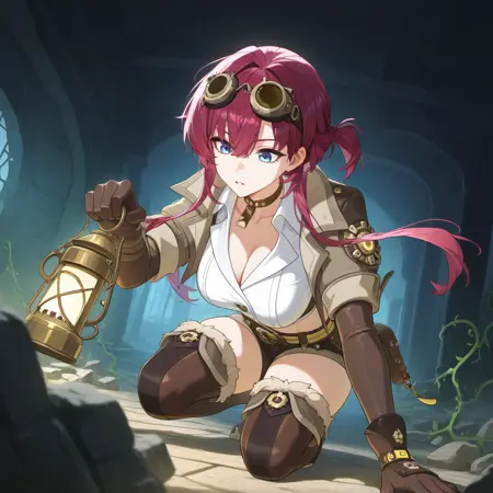 LeonaStrv, Lna_Adv, 長い髪の束のある短い髪、赤髪、紫髪、青い目、丸型サングラス、ゴーグル、頭にゴーグル、短めのシャツ、襟付きシャツ、白いシャツ、胸元のカットアウト、茶色のベルト、ウエスト下、腹部、へそ、黄色のベルト、鎖骨、クロスベルト、バックル、ギア、ベルトポーチ、短いショートパンツ、濃い茶色のショートパンツ、別スタイルの短めのジャケット、薄い茶色のジャケット、茶色のチョーカー、肘用手袋、茶色の手袋、リストストラップ、太ももブーツ、茶色の靴、毛皮縁取りの靴、