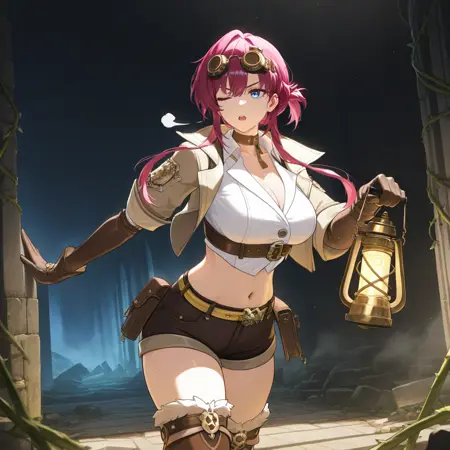 LeonaStrv, Lna_Adv, short hair with long locks, red hair, purple hair, blue eyes, round eyewear, goggles, goggles on head, cropped shirt, collared shirt, white shirt, cleavage cutout, brown belt, underbust, midriff, navel, yellow belt, collarbone, crossed belts, buckle, gears, belt pouch, short shorts, dark brown shorts, alt cropped jacket, light brown jacket, brown choker, elbow gloves, brown gloves, wrist strap, thigh boots, brown footwear, fur-trimmed footwear,