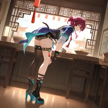 LeonaStrv, Lna_CN, short hair with long locks, red hair, purple hair, blue eyes, chinese clothes, two-tone clothes, short dress, blue dress, red dress, two-tone dress, shirt under dress, white shirt, shirt, asymmetrical clothes, white sleeves, uneven sleeves, blue sleeves, red sleeves, single thighhigh, brown thighhighs, asymmetrical legwear, thighlet, layered sleeves, single fingerless glove, dark brown glove, wristband, shorts under dress, black shorts, short shorts, loose belt, brown belt, gold trim, high heel boots, black boots,