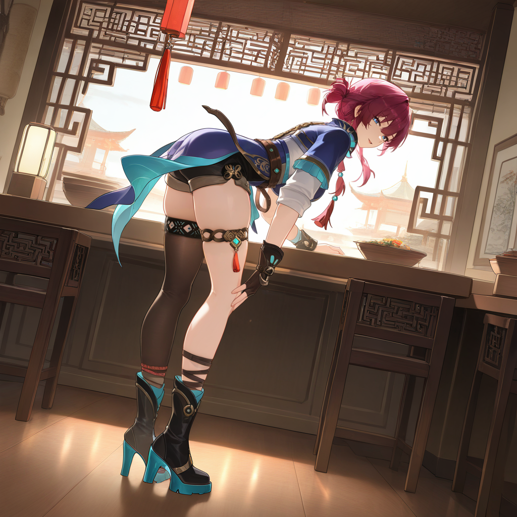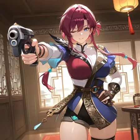 LeonaStrv, Lna_CN, 長い髪の束のある短い髪、赤髪、紫髪、青い目、中国服、ツートーンの服、短いドレス、青いドレス、赤いドレス、ツートーンのドレス、ドレスの下のシャツ、白いシャツ、シャツ、非対称な服、白い袖、不均等な袖、青い袖、赤い袖、片側のハイレッグ、茶色のハイレッグ、非対称な脚元、太もも丈、重ねた袖、片方の指なし手袋、濃い茶色の手袋、リストバンド、ドレスの下のショートパンツ、黒いショートパンツ、短いショートパンツ、ゆるいベルト、茶色のベルト、金のトリム、ハイヒールブーツ、黒いブーツ、