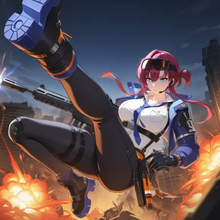 LeonaStrv, Lna_Def, short hair with long locks, red hair, purple hair, blue eyes, ski goggles, tinted eyewear, goggles on head, police uniform, dress shirt, open collar, collarbone, snap-fit buckle, shirt tucked-in, blue necktie, chest harness, chest strap, white shirt, breast pocket, underbust, black belt, suspenders, orange belt, buttons, black pants, pants, cropped jacket, open jacket, blue jacket, puffy long sleeves, blue sleeves, orange trim, pouch, two-sided gloves, black gloves, headset, kneepads, thigh strap, black footwear, ankle boots,