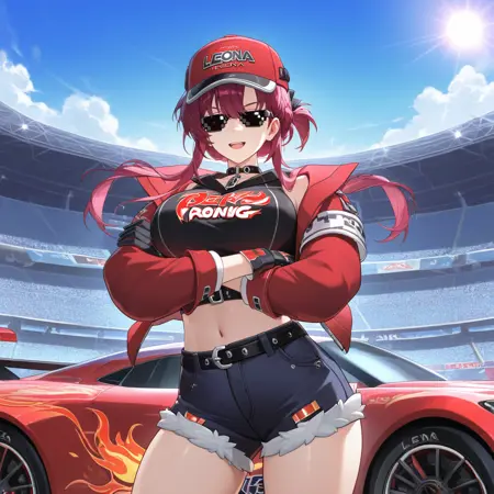 LeonaStrv, Lna_Gmr, 長い髪の束のある短い髪、赤髪、紫髪、青い目、赤いジャケット、ジャケット、部分的に開いたジャケット、赤い頭部装備、白い靴下、赤い靴、スニーカー、キャップ、サングラス、ペンダントチョーカー、黒いシャツ、クロップドトップ、ノースリーブシャツ、黒いベルト、ウエスト下、腹部、へそ、ふくらんだ袖、赤い袖、火のプリント、黒いリボン、毛皮縁取りのショートパンツ、デニムショートパンツ、濃い青のショートパンツ、太ももベルト、白い腕章、赤い袖口、黒い手袋、手袋、