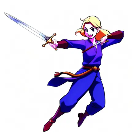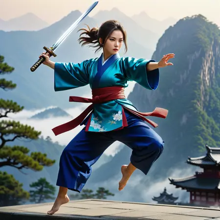 hair blowing in wind,mid-air,flowing fabric,motion blur,low angle,floating,falling,sky background,arms bent,knees bent,punching,kicking등과 같은 태그캐릭터 유형: 슈퍼히어로, 무술가, 댄서, 꿈같은 인물