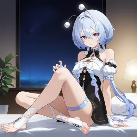 YugiriStrv, Ygr_Y2k, light blue hair, long hair, low twintails, purple eyes, fake antennae, hair bow, white bow, mini bowtie, black bowtie, frilled collar, white collar, pendant, frilled dress, front slit, light blue bow, frilled bow, puffy detached sleeves, puffy short sleeves, bare shoulders, sleeve belt, frilled sleeves, white sleeves, glove cutout, white gloves, fingerless gloves, halter dress, short dress, alt white dress, thigh ribbon, white ribbon, cleavage cutout, criss-cross halter, striped, beads, black dress, two-tone dress, stirrup legwear, white footwear, ankle lace-up,