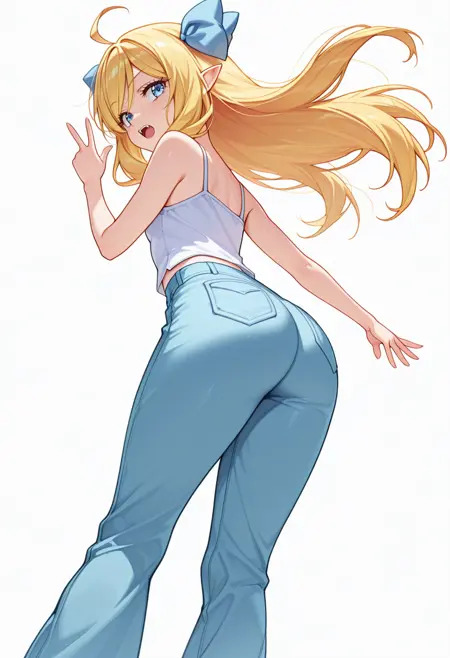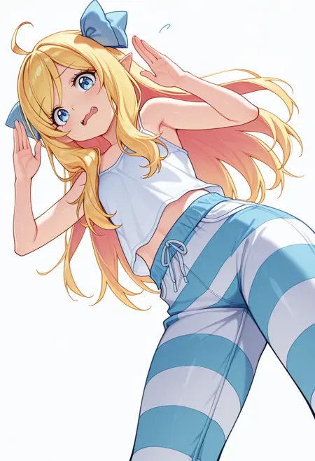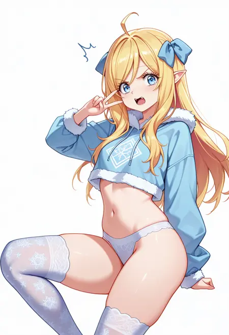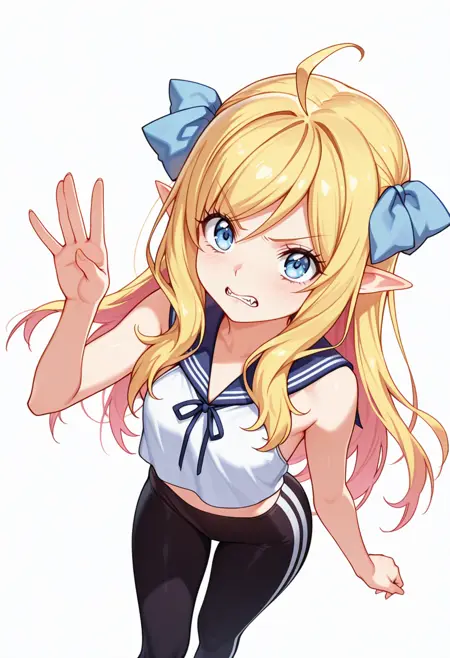 jashin_cnr, 1girl, blonde hair, long hair, ahoge, blue eyes, pointy ears, fangs, hair ribbon,