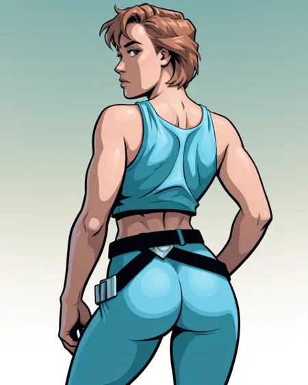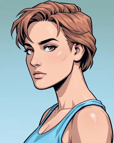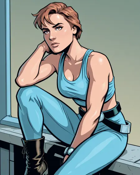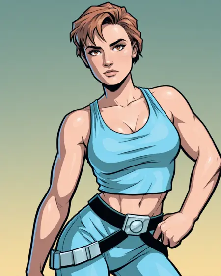 Triggers: plourr, 1girl, short hair, brown hair, brown eyes, tank top, midriff, belt, pants,