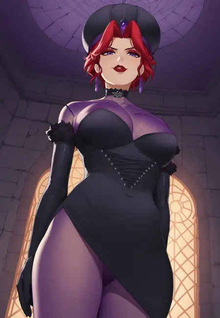 hat, dress, purple see-through bodystocking, fur trim elbow gloves, choker,