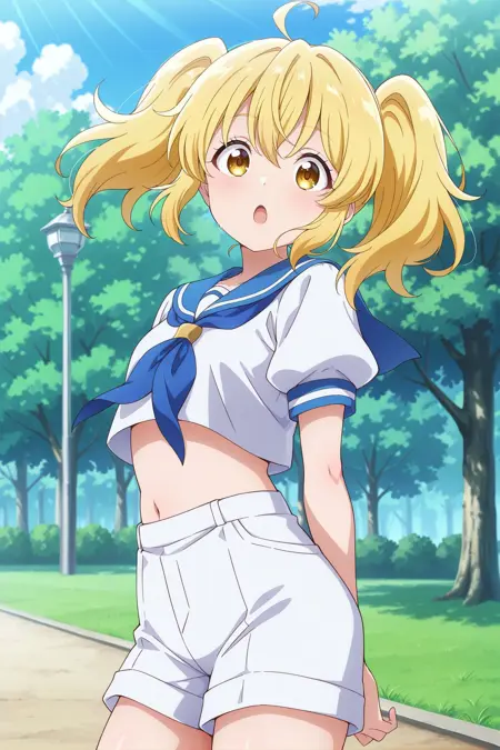 sailor hat, white hat, blue neckerchief, blue sailor collar, sailor shirt, white shirt, cropped shirt, puffy short sleeves, white shorts,