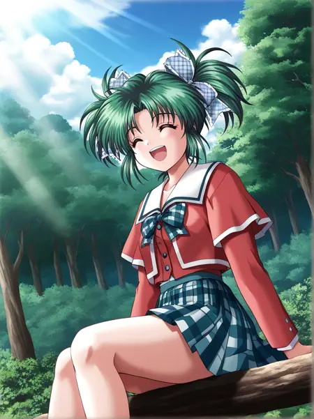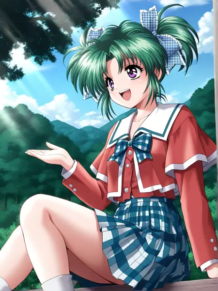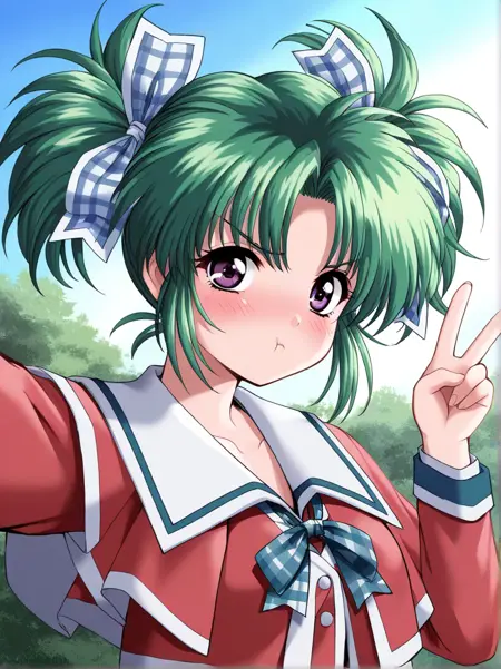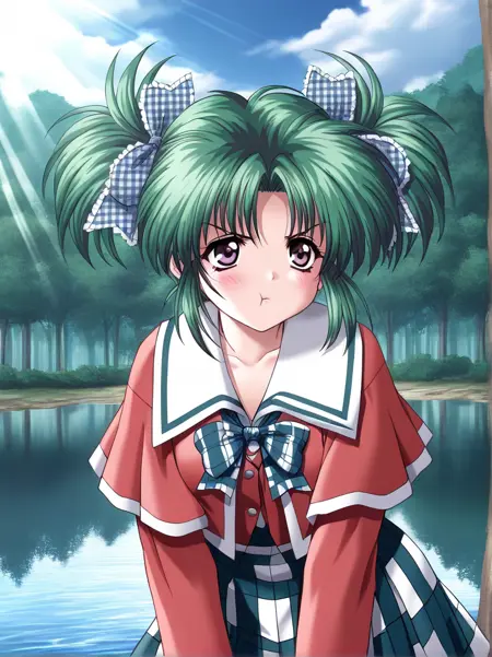 Minase_Ruka, 1girl, solo, green hair, short twintails, purple eyes, hair ribbon, blue plaid ribbon, flat chest,