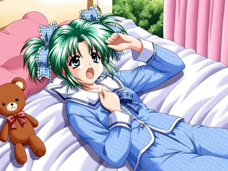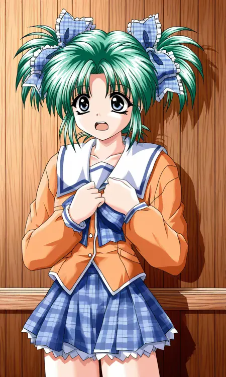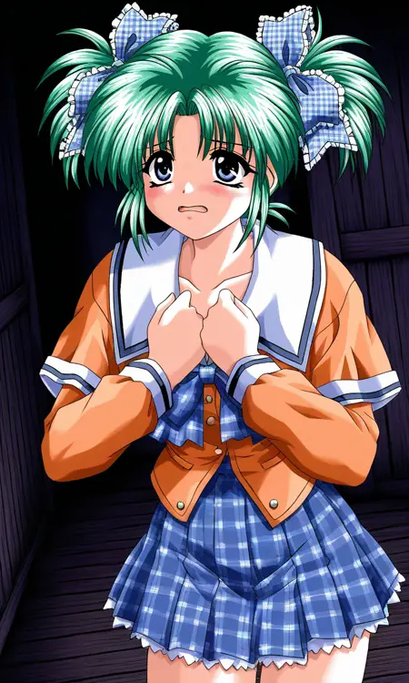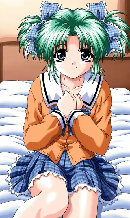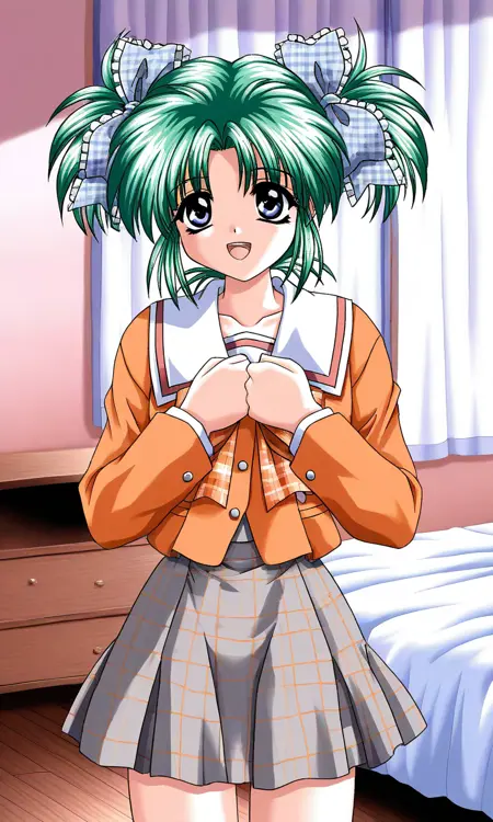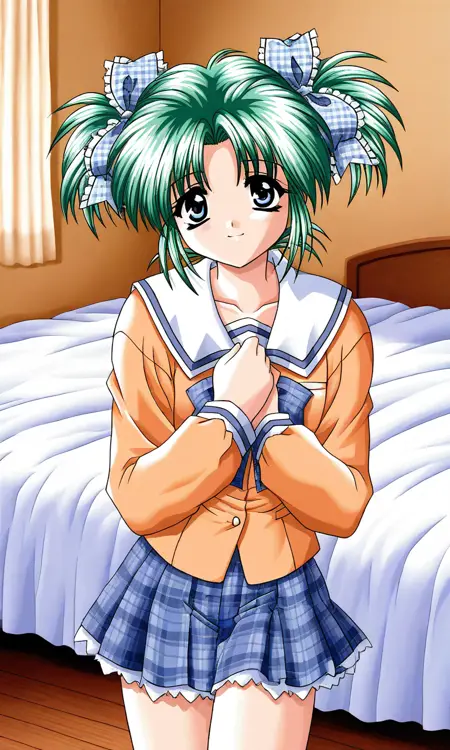 Minase_Ruka, 1girl, solo, green hair, short twintails, purple eyes, hair ribbon, blue plaid ribbon, flat chest,