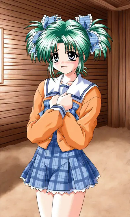 ※当然,本角色并未在示例中加入任何“那方面”的咒语,因此示例中的体型与外观皆为正常JK比例,比游戏中更显高挑。若想让她变小,请自行尝试相关咒语。
