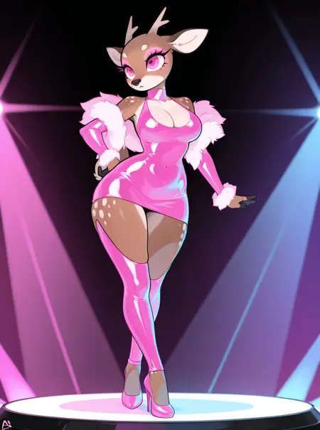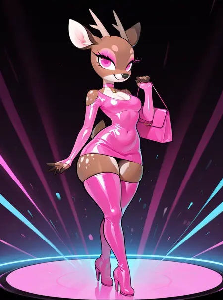 Triggers: anthro, female, deer, cervine, wide hips, pink clothing, thick thighs, bodycon, pink eyeshadow, pink eyes, long eyelashes, thigh boots, high heel boots, choker
