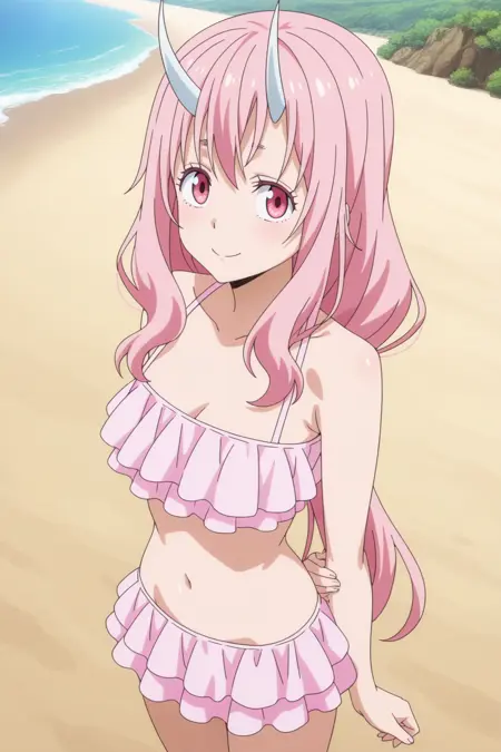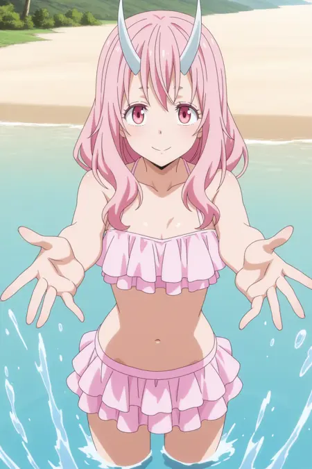 aashuna, white horns, pink eyes, pink hair, shunaswim, swimsuit, pink bikini, frilled bikini, bikini skirt, anime coloring,