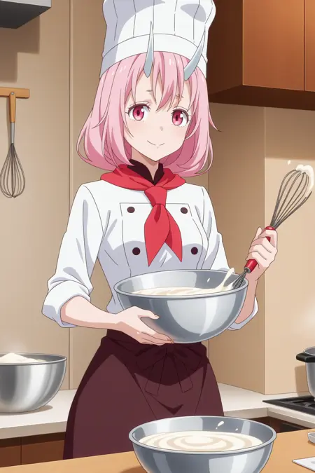 aashuna, white horns, pink eyes, pink hair, shunachef, chef hat, white shirt, red neckerchief, waist apron, brown apron, anime coloring,