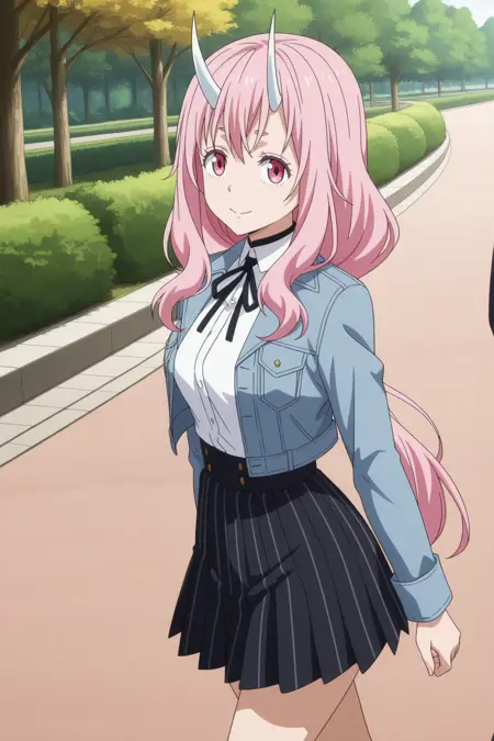 aashuna, white horns, pink eyes, pink hair, shunaguard, black blazer, white dress shirt, black necktie, closed jacket, black belt, black skirt, pleated skirt, anime coloring,