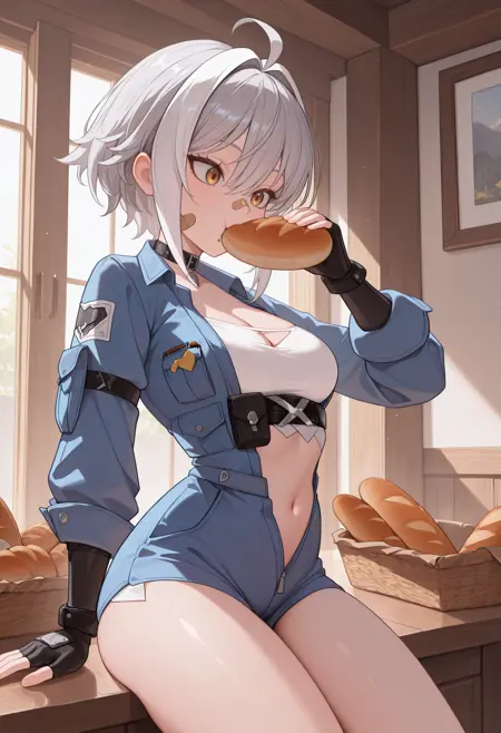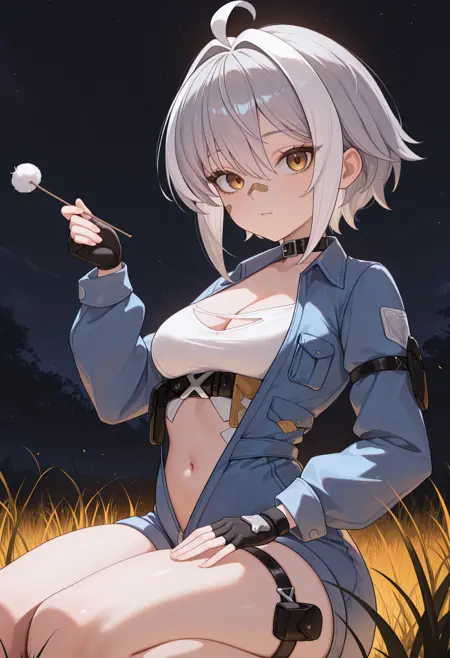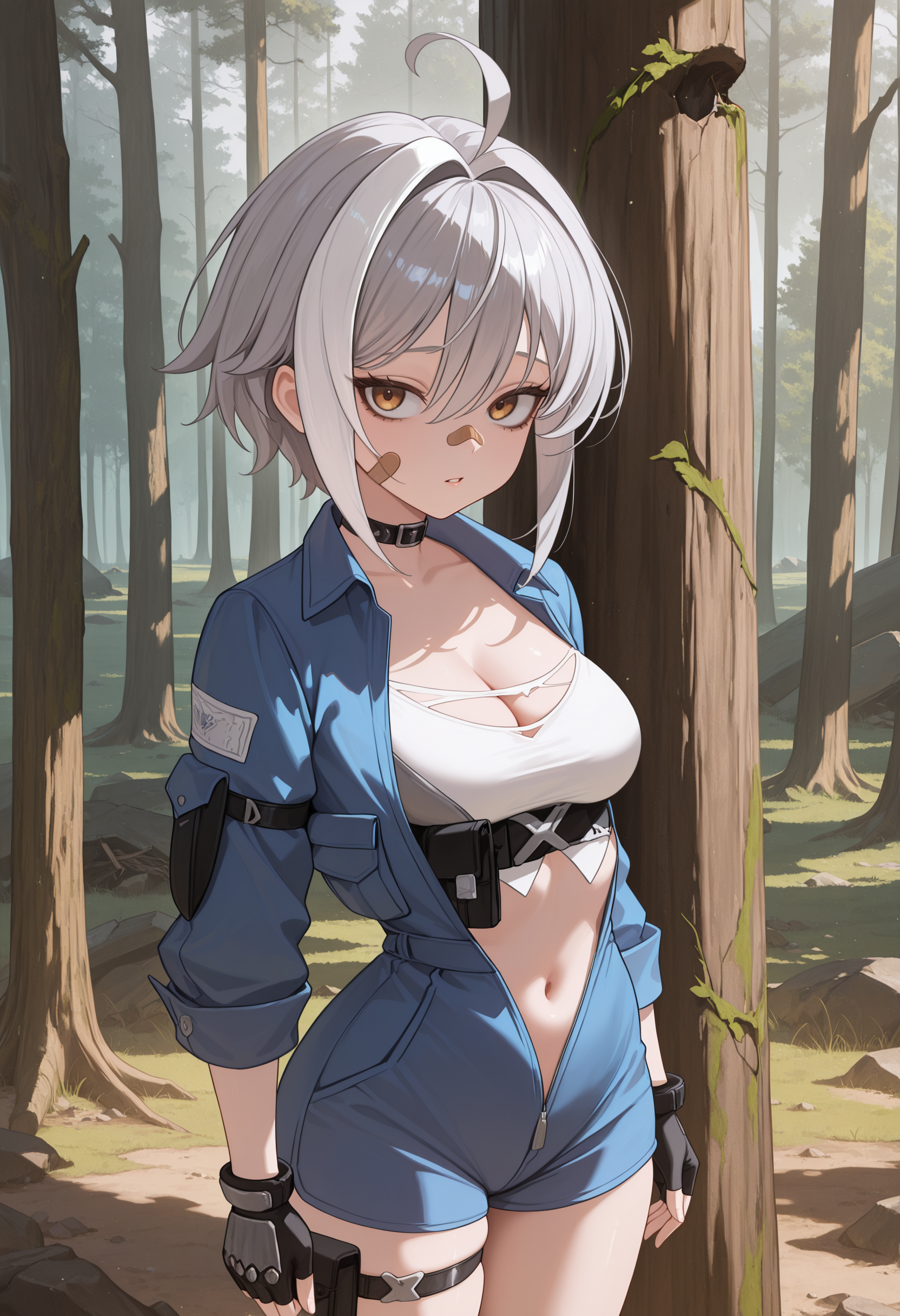 mrnk, brown eyes, yellow eyes, grey hair, white hair, streaked hair, short hair, hair between eyes, ahoge, bandaid on nose, bandaid on face, black choker, medium breasts, blue jumpsuit, long sleeves, open clothes, navel, white shirt, crop top, cleavage, thigh strap, black gloves, fingerless gloves