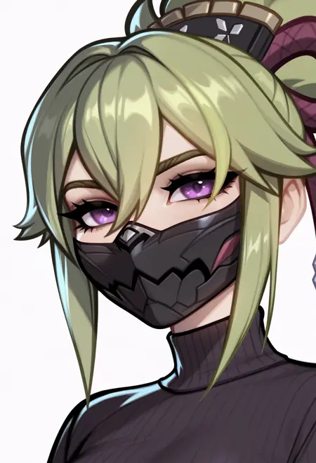 • 옷 태그: 닌자 마스크, 검은 마스크, 보라색 재킷, 열린 재킷, 핏된 재킷, 긴 소매, 크롭탑, 검은 셔츠, 피시넷 탑, 복부, 배꼽, 어깨 갑옷, 검은 장갑, 부분적으로 손가락이 없는 장갑, 검은 손톱, 짧은 반바지, 검은 반바지, 밧줄, 시메나와, 검은 허벅지 양말, 다리 갑옷