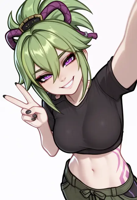 • 캐릭터 태그: 녹색 머리카락, 꼬리머리, 눈 사이 머리카락, 머리 장식, 보라색 눈, 옆머리, 엉덩이 문신