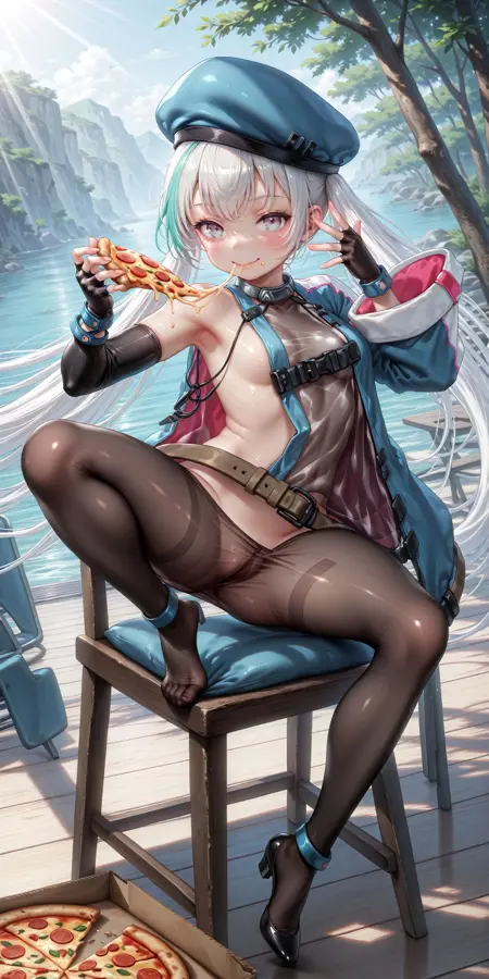 Janis-Main,purple eyes,beret,single elbow glove,asymmetrical sleeves,asymmetrical clothes,pantyhose,fingerless gloves,see-through,no panties,heels,anklet,belt,
