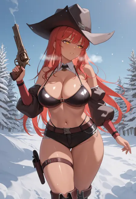 vlmcb、黄色い目、濃い肌色、日焼け、赤髪、長い髪、前髪、黒い帽子、大きな胸、取り外し可能な首輪、黒い水着、Oリング、胸元、腹部、黒いショートパンツ、マイクロショーツ、タンガ、取り外し可能な袖、ベルト、膝上ブーツ、カウボーイ、太ももストラップ