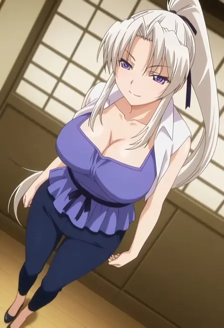 Tagging words : high ponytail, white hair, long hair, hair ribbon, purple eyes, large breasts, cleavage, bare shoulders, blue navy pants, black shoes, purple top dress or purple chemise