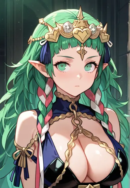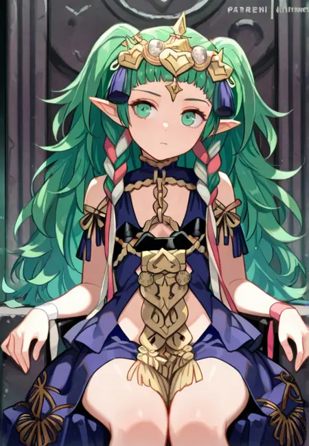 sothis, 1girl, 丝带辫子, 单人, 长发, 尖耳朵, 绿发, 绿眼, 双辫子, 王冠, 头饰, 饰品, 连衣裙