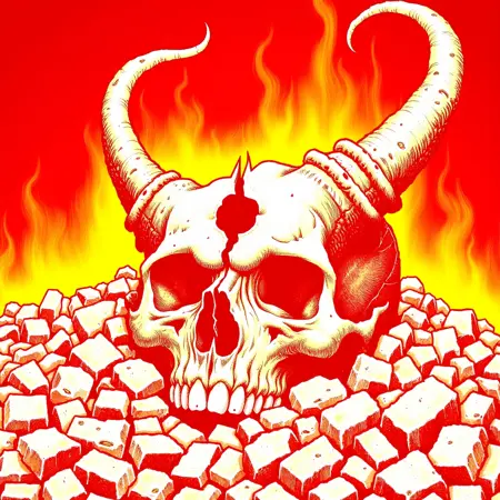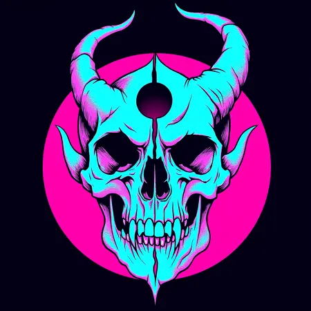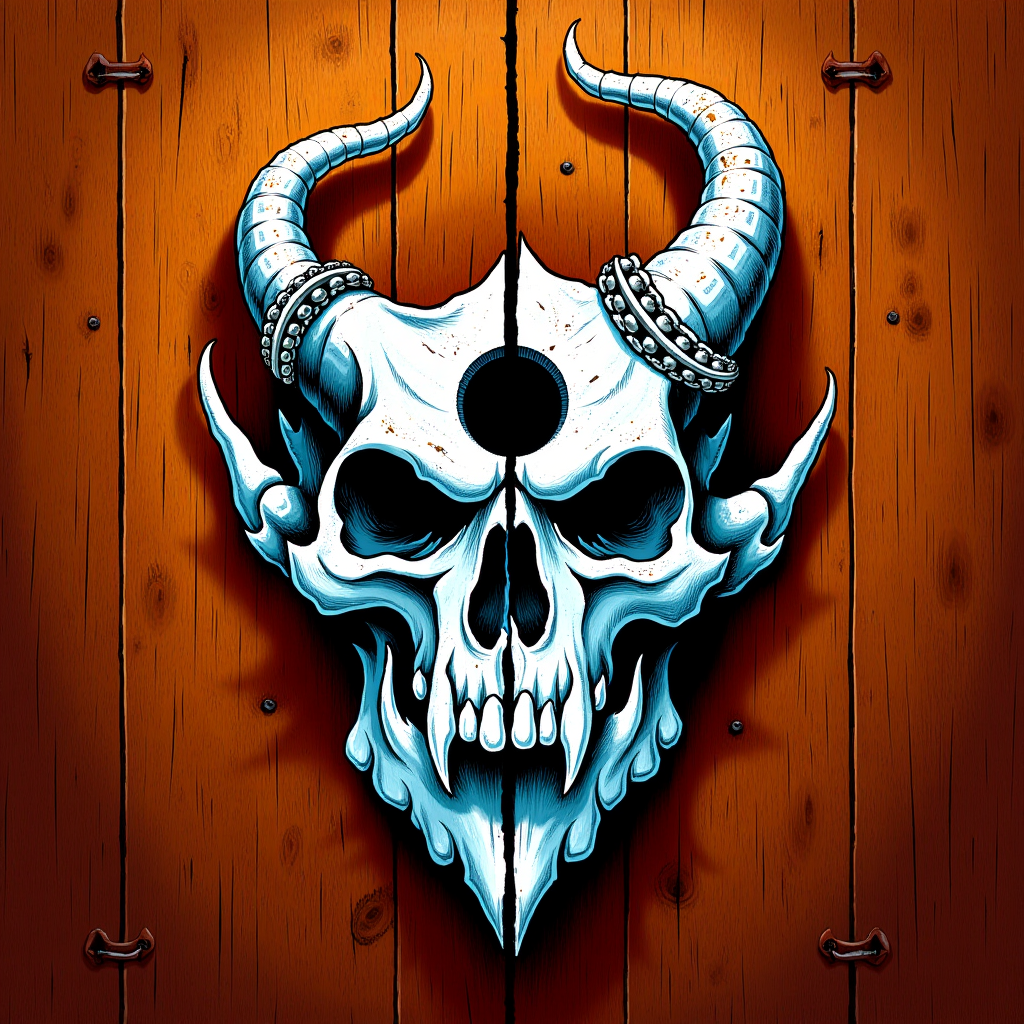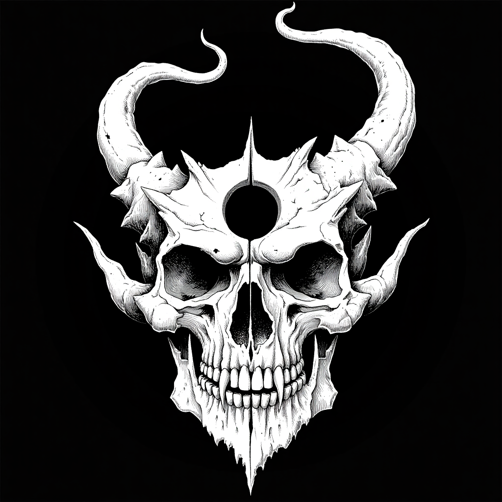 タグ: 額に穴の開いた悪魔の頭骨、悪魔的、頭骨、角、人間なし、ヘヴィメタルアルバムカバー、