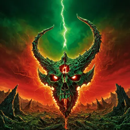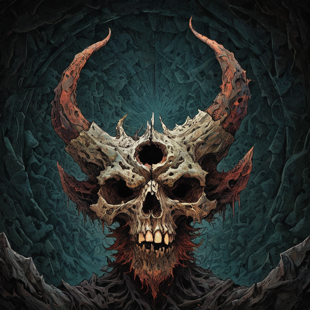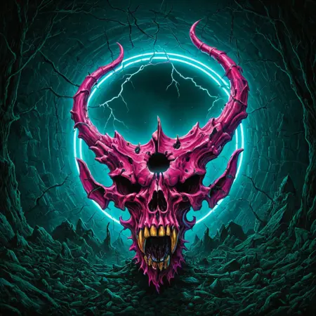 This is a concept model trained on album art from the heavy metal band "Demon Hunter". Their albums often feature a reoccurring concept of a demon's skull with a hole in its forehead. This lora aims to capture that concept. Feel free to check out the bands wiki page or website if you want to know more about them, they create some awesome music in my opinion.
