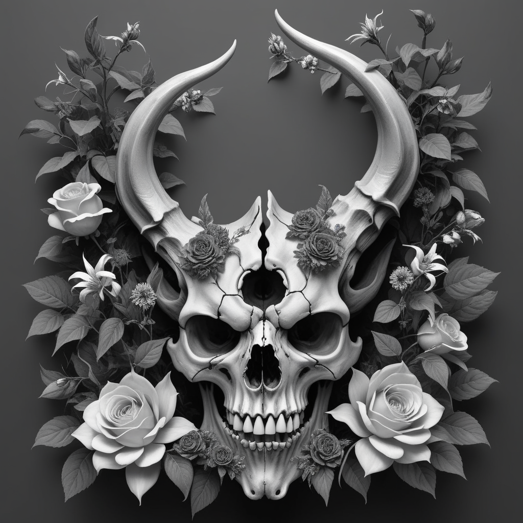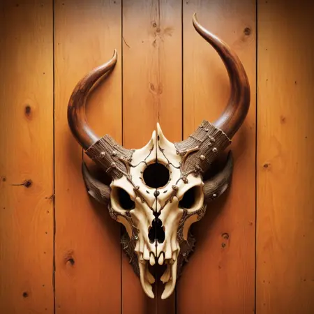 Tags: A demon's skull with a hole in the forehead, demonic, skull, horns, no humans, heavy metal album cover,