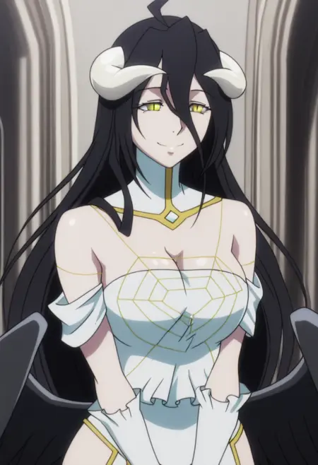 트리거 = zzalbedozz, 태그 = 1girl, 뿔, 긴 머리카락, 검은 머리카락, 노란 눈, 악마 뿔, 싱글, 날개, 드레스, 가슴, 어깨 노출, 검은 날개, 장갑, 흰 드레스, 눈 사이의 머리카락, 미소, 흰 장갑, 세로 동공, 가슴 사이의 틈, 큰 가슴, 애니메이션 컬러링,