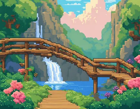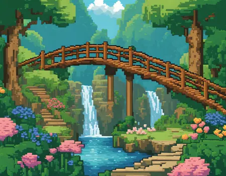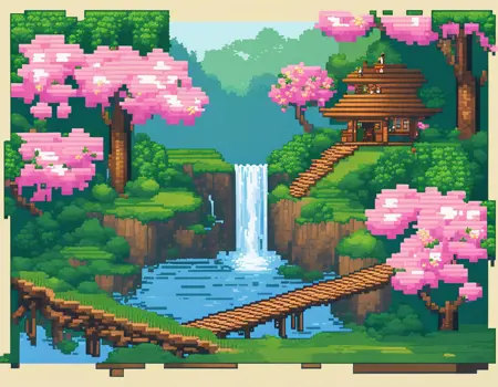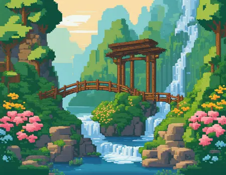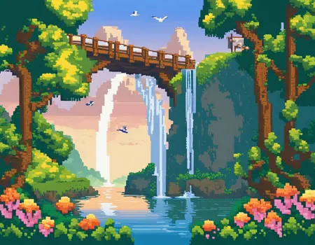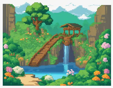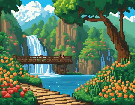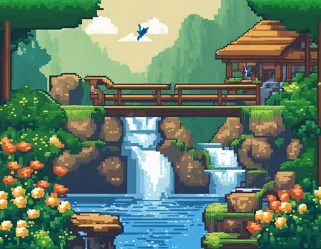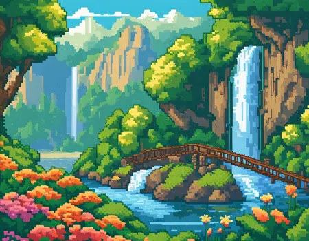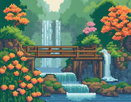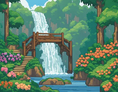 This is a Waterfall in the Forest in Pixel-Art Style.