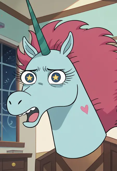 1girl, solo, unicorn, Ponyhead_SVTFOE, light blue fur, pink mane, blue eyes, gold stars pupils, teal striped horn, pink heart tattoo