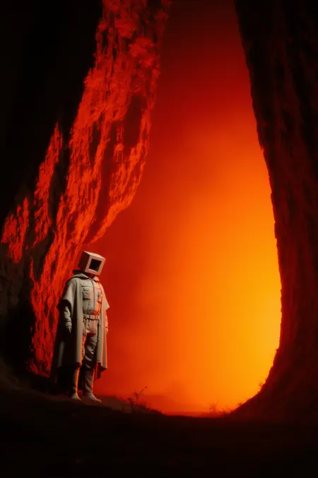 提示词二:这张照片捕捉到一个人站在深邃洞穴中,洞口透入橙色光线,在明暗之间形成强烈对比。人物身着白灰相间的制服,外披一件破旧肮脏的斗篷,位于画面左侧,目光并未直视相机。图像背景主要由鲜艳浓烈的橙色光芒主导,照亮了画面右侧,这光芒似乎从洞穴一端涌入。洞壁纹理粗糙不平,清晰可见,与灼热物质明亮近乎白炽的表面形成鲜明反差。