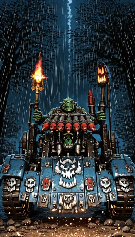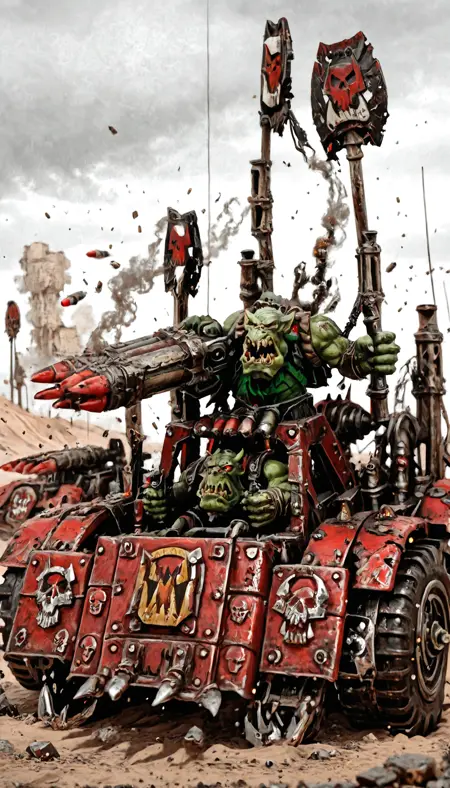 Orc Buggy Warhammer 40k LoRAは、Warhammer 40kの世界観にインスパイアされた、粗野でスケールの大きいオーグ戦闘バギーを生成するために調整されています。このモデルは、バラバラの金属を溶接して組み立てられた非対称な装甲車両、大口径の釘付きタイヤ、前面に取り付けられた刃、露出したエンジン、そしてトライブなオーグの装飾を特徴としています。各レンダリングは、オーグの戦闘マシンに典型的な生の金属、戦場での摩耗、そして混沌とした工学を強調しています。