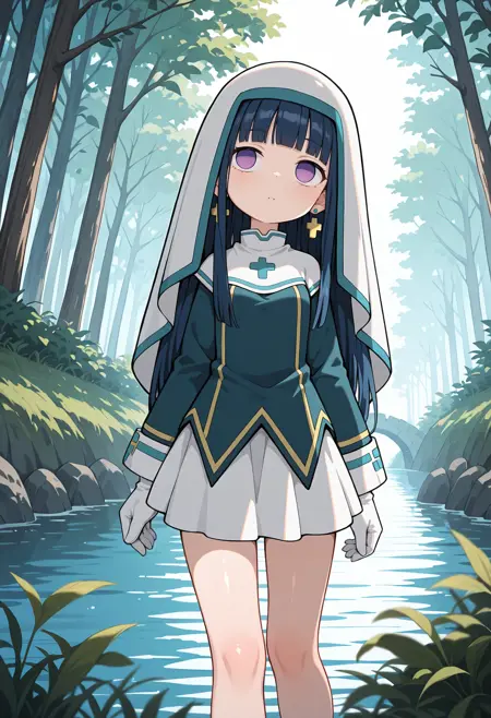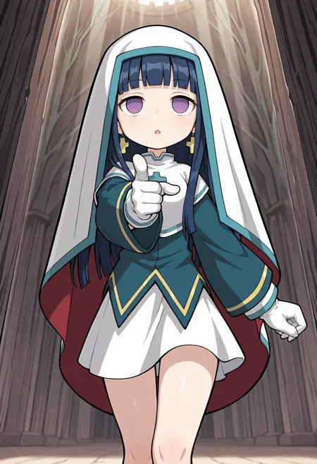 默认服装:lishaoutfit1,齐刘海,闭眼,修女,修女服,十字架耳环,白色手套,长袖,白色裙子